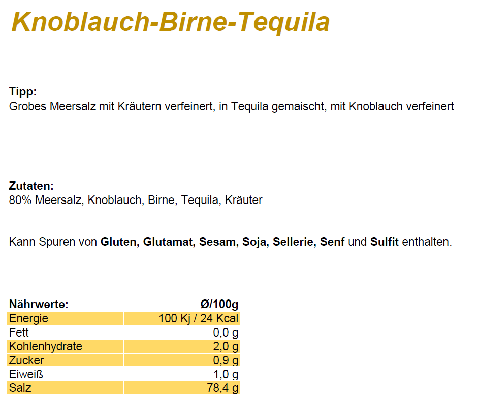 Grobes Meersalz mit Kräutern verfeinert, in Tequila gemaischt, mit Knoblauch verfeinert